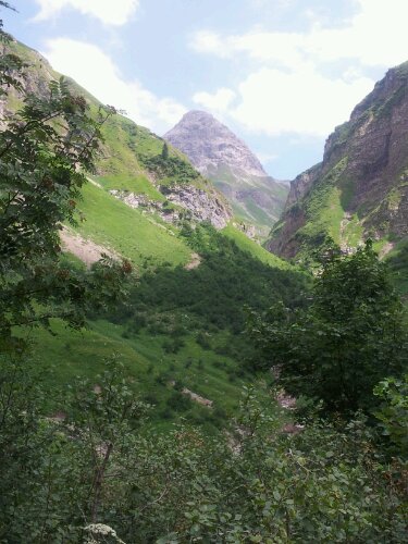 Wir laufen über schöne Blumenwiesen, für die wir nicht so wirklich einen Blick haben. Die Sonne brennt unbarmherzig und es gibt fast keinen Schattenplatz zum rasten. Alles hat irgendwann ein Ende, auch diese Quälerei. Als erstes hilft uns eine große Wolke. Ich hätte nicht gedacht, dass ich mich darüber freuen würde. Wenig später gibt es Abkühlung durch einen Wasserfall direkt neben dem Weg. Das dieser noch steiler wird, spielt jetzt keine Rolle mehr. Nun fallen uns auch die Wiesen und die vielen Gipfel rundherum wieder auf.