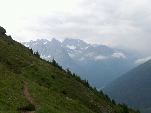 Auf der Alm gibt es frische Milch, die richtig nach Milch schmeckt und es wird auch Käse hergestellt. Wir treffen zwei Wanderer wieder, die auf der Memminger Hütte unseren Tisch geteilt haben. Die wollen trotz Unwetterwarnung auf die Verpeilhütte und das in Anbetracht der fortgeschrittenen Zeit. Die Wirtin warnt eindringlich. Wir sind froh, dass wir die lange Tour in zwei Etappen aufgeteilt haben. Unter nunmehr grauem Himmel laufen wir auf einem wunderbaren Panoramahöhenweg in ständigem Auf und Ab hoch über dem Kaunertal. Wir sehen die gezackten, schneebedeckten Spitzen des Kaunergrats vor uns und freuen uns auf die nächsten Etappen. Es dauert nicht lang und wir dürfen endlich unsere Regenkleidung testen. Da ab morgen wieder bestes Wetter, auch für die nächsten Tage vorhergesagt ist, haben wir sie wenigstens einmal eingesetzt und nicht umsonst mitgeschleppt.