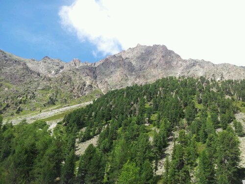 Der Himmel ist blank geputzt u.d die Sicht ist für Sommer außerordentlich gut. Entlang eines Baches, den wir später queren, geht es durch Zirbenwald stetig aufwärts. Heute sind wir an dem Punkt angekommen….