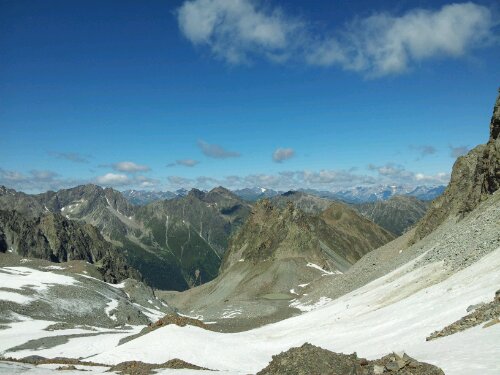 Es geht weiter stetig bergauf in Richtung aperes Madatschjoch. Wir kommen an einem kleinen Bergsee vorbei, dessen Temperatur wir aufgrund der umliegenden Altschneefelder nicht prüfen. Jetzt sehen wir auch den Madatschferner, einen Gletscher, der früher sicherlich viel größer war und den es sicher in ein paar Jahren nicht mehr geben wird. Wir steigen jetzt, ziemlich anstrengend über Altschneefelder aufwärts. Kurzärmlig bekleidet gibt das ein witziges Bild.