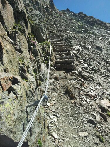 Gestärkt nach gutem Essen und einem kurzen Gespräch mit unseren Tischnachbarn von der Kemptner Hütte geht es bei mehr als 30 Grad für eine Stunde leicht bergauf. Dort wartet unerwartet Unterstützung auf uns. Wir können einen Rucksack mit der Materialseilbahn der Memminger Hütte transportieren lassen. Die wichtigsten Sachen nehmen wir jedoch selbst mit. Man weiß ja nie, ob alles heil ankommt. Das Teil ist ziemlich beladen. Jetzt kommt nach 4 Stunden erst der eigentliche Aufstieg mit etwas mehr als 800 hm.